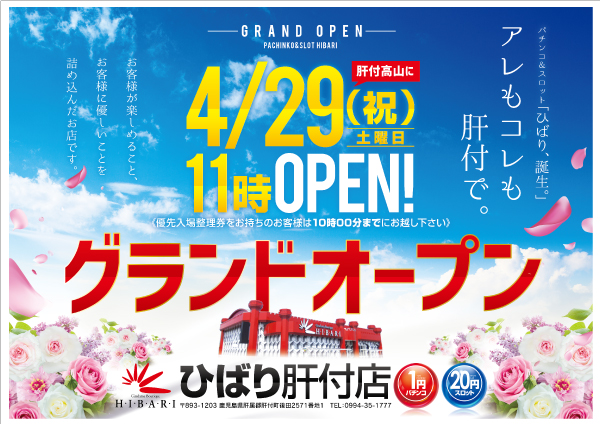 鹿児島県肝属郡のHIBARIヒバリ肝付店は4/29(日)11:00にグランドオープンします。