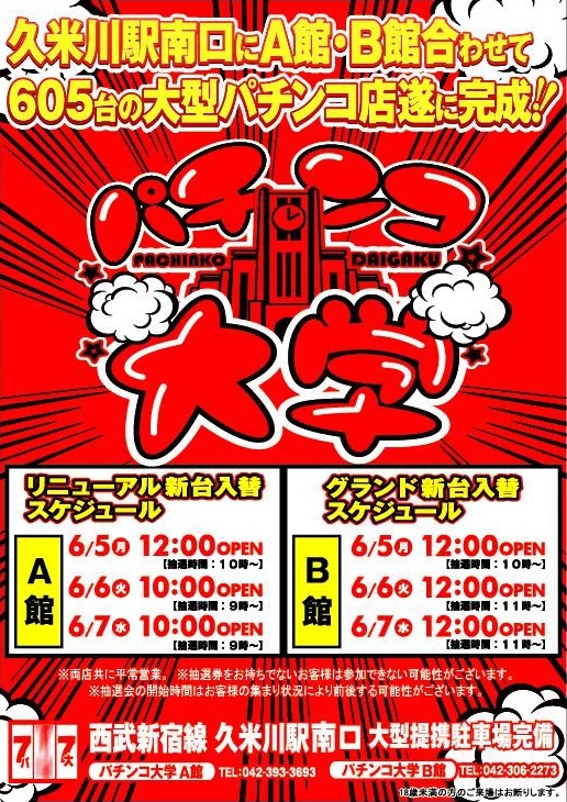 東京都東村山市のパチンコ大学久米川店B館は6/5(月)12:00にグランドオープン!