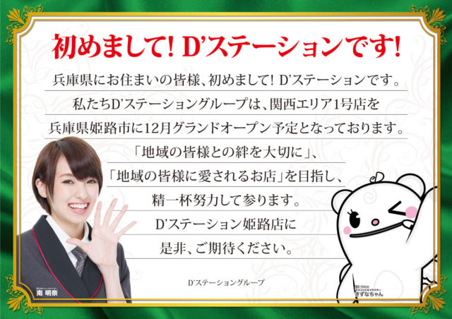 兵庫県姫路市のディーステーション姫路店は12/29(金)にグランドオープンします
