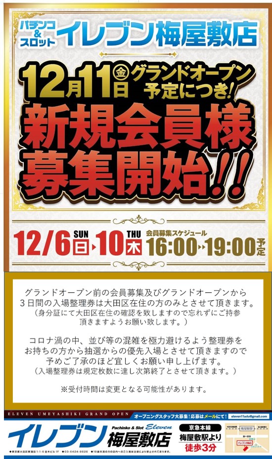 【確定】イレブン梅屋敷店は12/11(金)にグランドオープン/東京都大田区 グランドオープン 2020.12.032020.12.09目次東京都大田区のイレブン梅屋敷店は12/11(金)にグランドオープンオープン日、スケジュール東京都大田区のイレブン梅屋敷店は12/11(金)にグランドオープンオープン日、スケジュール イレブン梅屋敷店店(ピーワールド) 新規会員募集と入場整理券の配布は12/6(日)~12/10(木)まで。募集時間が16時~19時のみとなっているようなので注意が必要です。 入場整理券はグランドオープンから3日分が配布されますが、大田区在住の人のみが対象となります。 【確定】イレブン梅屋敷店は12/11(金)にグランドオープン/東京都大田区のオリジナルページに行く [FFMarket] 耳栓 大量セット 50ペア100個 シリコン フリンジ 騒音 安眠 楽器 パチンコ 射撃 医療 検査ライブ MRI 勉強 水泳 旅行 工事 聴覚過敏 洗える (ブルー)価格: 880円商品を見る【送料無料】TOMMYFIELD スリングショット 替えゴム 狩猟用 パチンコ ゴム銃 パチンコスリングショット [並行輸入品] サイズ:厚さ2mm価格: 3740円商品を見る【送料無料】【楽天ランキング1位獲得】TOMMYFIELD スリングショット 替えゴム パチンコ 狩猟用 パチンコ銃 ゴム銃 パチンコゴム [並行輸入品] 色:オレンジ価格: 3776円商品を見るパチンコ必勝ガイドMAX (マックス) 2025年 12月号 [雑誌]楽天ブックスAmazon楽天パチンコ必勝ガイドMAX 2025年11月号【雑誌】【1000円以上送料無料】bookfan 2号店 楽天市場店Amazon楽天パチスロ必勝ガイド MAX (マックス) 2025年 11月号 [雑誌]楽天ブックスAmazon楽天 Amazonでパチンコ必勝ガイドを探す