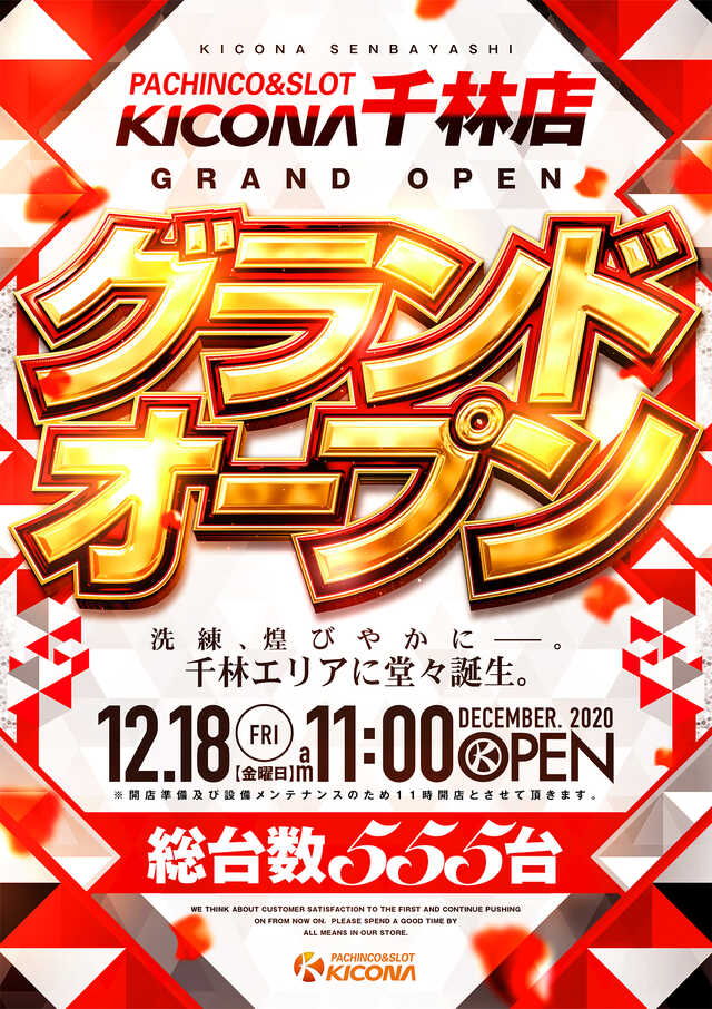 【確定】キコーナ千林店は12/18(金)にグランドオープン(大阪市旭区) グランドオープン 2020.12.14 大阪府大阪市旭区のキコーナ千林店は12/18(金)11:00にグランドオープン オープン日、スケジュール キコーナ千林店(ピーワールド) 総台数555台(パチンコ371台、スロット184台)、営業レートは4円パチンコ、1円パチンコ、0.5円パチンコ、10円スロット、5円スロットです。 新規会員募集は12/15(火)から12/17(木)まで、初日のみ旧プレイランド・ガネーシャ会員限定です。 グランドオープンスケジュールは4日間で、3日目まで11時オープン、その後は10時オープンとなります。 【確定】キコーナ千林店は12/18(金)にグランドオープン(大阪市旭区)のオリジナルページに行く 【バーゲンセール】【中古】DVD▼伝説の一発台vs羽根物台 パチンコ物語 レンタル落ち ケース無価格: 175円商品を見る【中古】 ○秘パチンコ必勝攻略本(part 3) / テン オクロック工房 / 双葉社 [単行本]【メール便送料無料】価格: 30374円商品を見るガルフィー(GALFY) ジャージ上下セット メンズ レディース パチンコセットアップ 142058 【ご自宅配送限定】‥価格: 11680円商品を見るパチンコ必勝ガイドMAX (マックス) 2025年 12月号 [雑誌]楽天ブックスAmazon楽天パチンコ必勝ガイドMAX 2025年11月号【雑誌】【1000円以上送料無料】bookfan 2号店 楽天市場店Amazon楽天パチスロ必勝ガイド MAX (マックス) 2025年 11月号 [雑誌]楽天ブックスAmazon楽天 Amazonでパチンコ必勝ガイドを探す