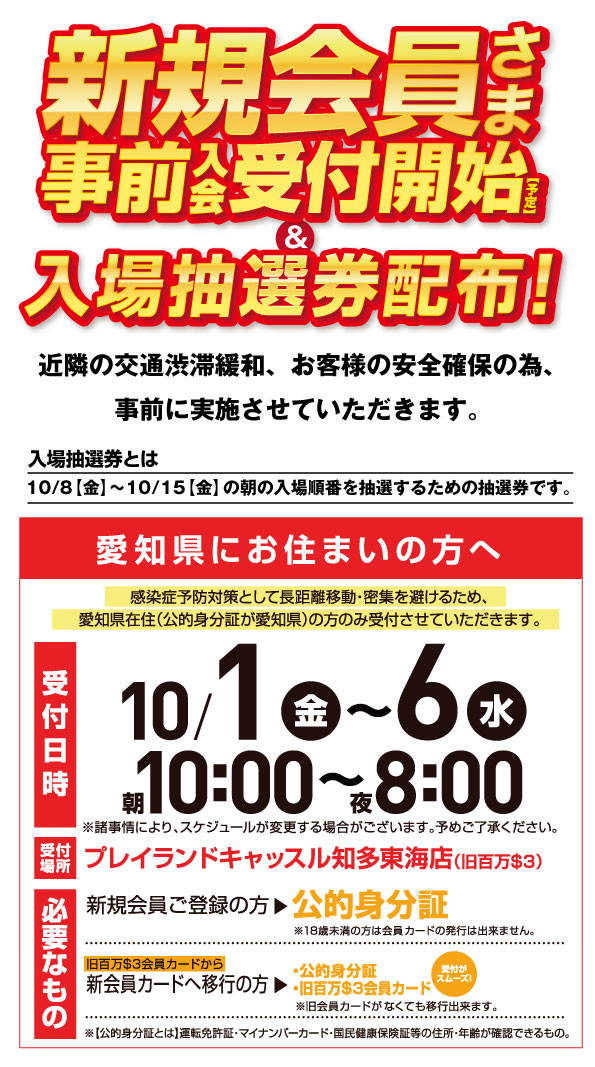 新規会員募集は10/1(金)10時から開始で感染予防対策として長距離移動・密集を避けるため愛知県在住(公的身分証が愛知県)の方のみ受付のようです。