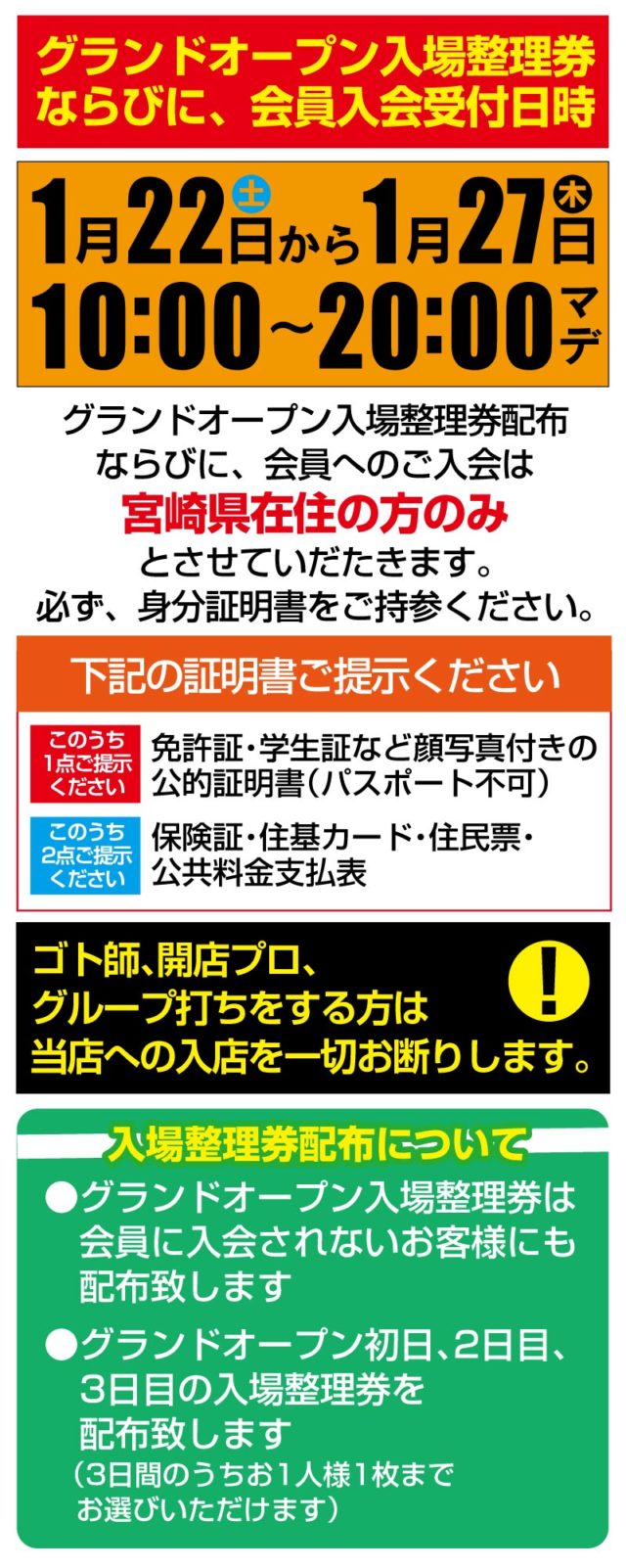 新規会員入会受付は1/22(土)から1/27(木)で連日10:00~20時まで受付。会員入会は宮崎県在住の方限定となっています。