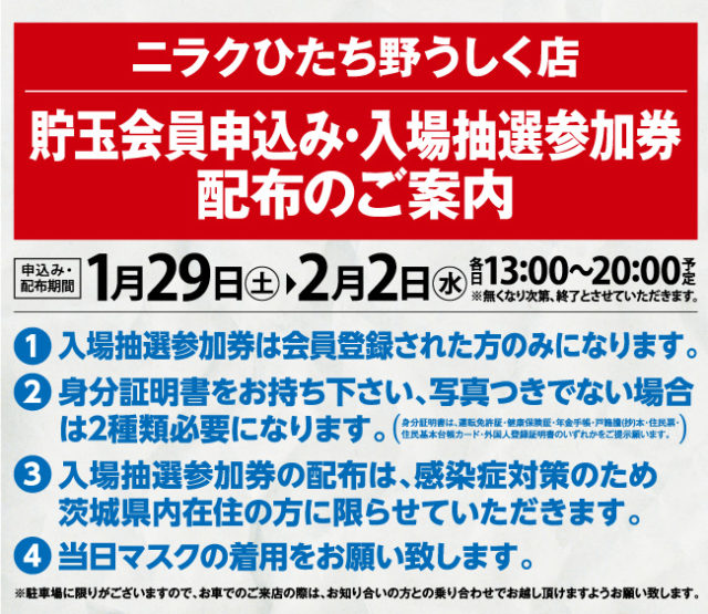 貯玉会員申込み期間は1/29(土)から2/2(水)で各日13時から20時まで。会員登録と同時に入場抽選参加券を配布。