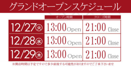 総台数1,200台(パチンコ680台、スロット520台)。グランドオープンスケジュールは3日分公開されていて、いずれも13:00~21:00の営業時間です。新規会員募集及び入場抽選権配布は12/17から実施されていて、7日分の入場抽選権が配られるみたい。時間は日によって異なりますので下記画像を参照ください。