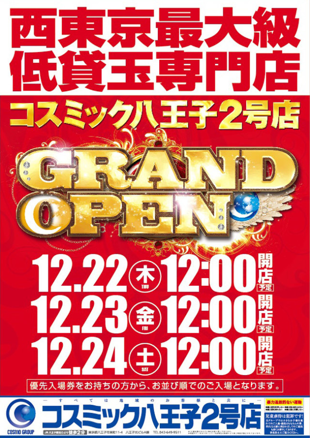 東京都八王子市のパーラーコスミック八王子2号店は12/22(木)12:00にグランドオープンします。