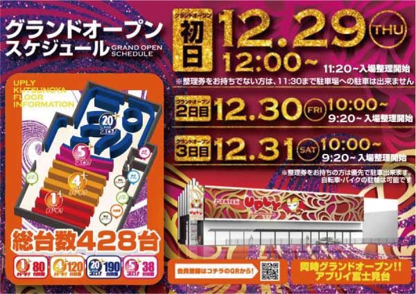 総台数428台(パチンコ200台、スロット228台)、4円パチンコ120台、1円パチンコ80台、20円スロット190台、5円スロット38台のパチンコ店です。整理券配布は昨日から開始されています。グランドオープンスケジュールは年末12/31まで公開されていますが、時短営業は初日のみ。