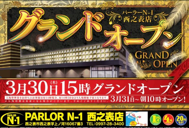 鹿児島県西之表市のパーラーN-1西之表店は3/30(木)15:00にグランドオープンします。
