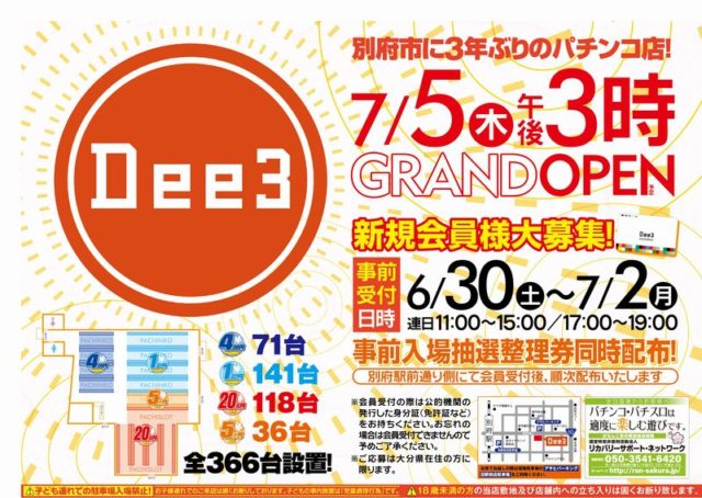 大分県別府市のディー3は7/5(木)15:00にグランドオープンします。