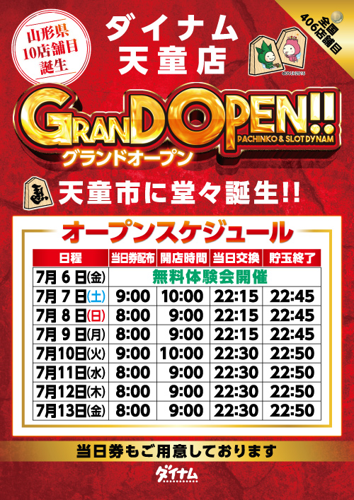 山形県天童市のダイナム山形天童店ゆったり館は7/7(土)10:00にグランドオープンします。