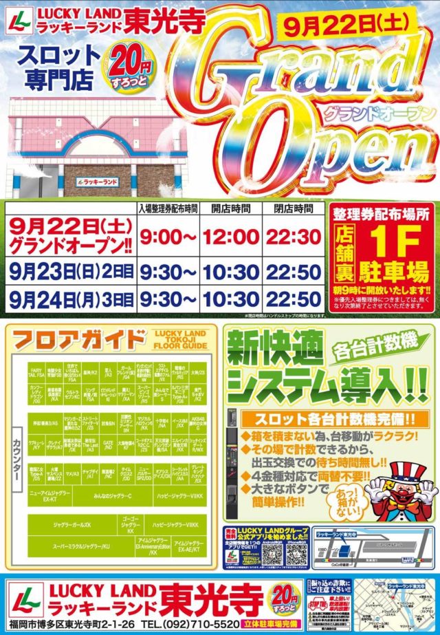 福岡県福岡市博多区のラッキーランド東光寺は9/22(土)12:00にグランドオープンします。