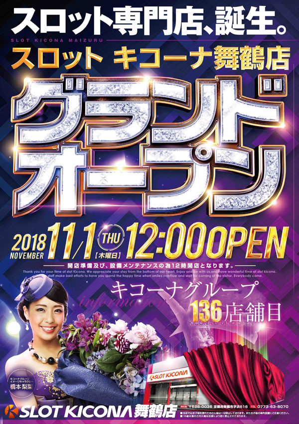 京都府舞鶴市のスロットキコーナ舞鶴店は11/1(木)12:00にグランドオープンします。