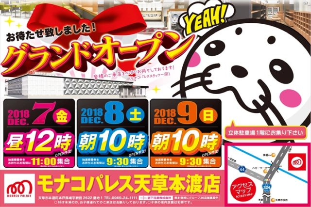 熊本県天草市のモナコパレス天草本渡店は12/7(金)12:00にグランドオープンします。