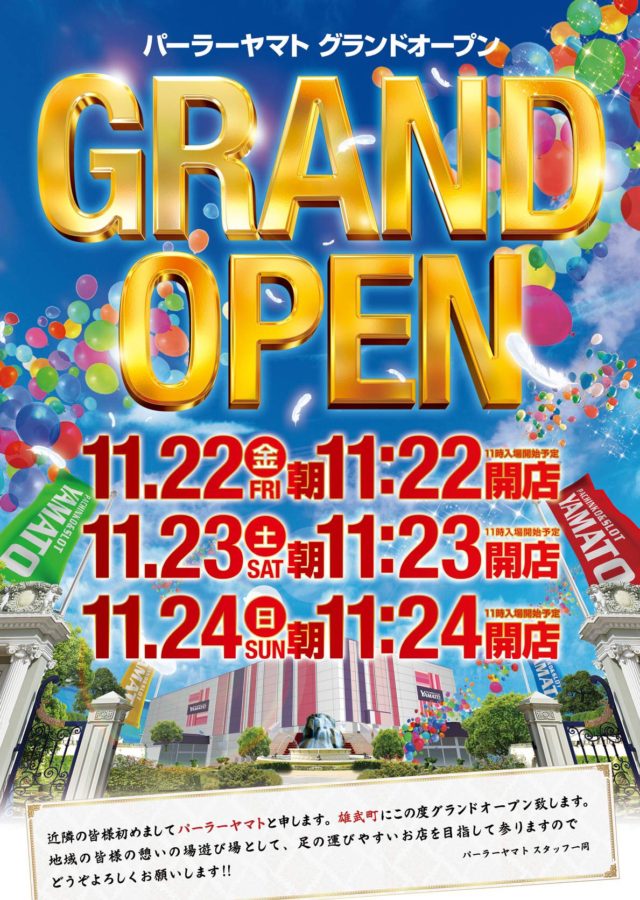 【確定】パーラーヤマト雄武店は11/22(金)グランドオープン/北海道紋別郡 グランドオープン 2019.11.21 北海道紋別郡のパーラーヤマト雄武店は11/22(金)11:22にグランドオープンします。 オープン日、スケジュール 台数などの情報お持ちの方いればツイッターのDMで教えてください。 グランドオープンスケジュールは3日間公開されていて、初日11/22(金)11:22オープン、11/23(土)11:23オープン、11/24(日)11:24オープンと、いずれも日付と時間が一緒というなかなか古典的な手法を行ってきます。 【確定】パーラーヤマト雄武店は11/22(金)グランドオープン/北海道紋別郡のオリジナルページに行く 商品が見つかりませんでした。パチンコ必勝ガイドMAX (マックス) 2025年 12月号 [雑誌]楽天ブックスAmazon楽天パチンコ必勝ガイドMAX 2025年11月号【雑誌】【1000円以上送料無料】bookfan 2号店 楽天市場店Amazon楽天パチスロ必勝ガイド MAX (マックス) 2025年 11月号 [雑誌]楽天ブックスAmazon楽天 Amazonでパチンコ必勝ガイドを探す
